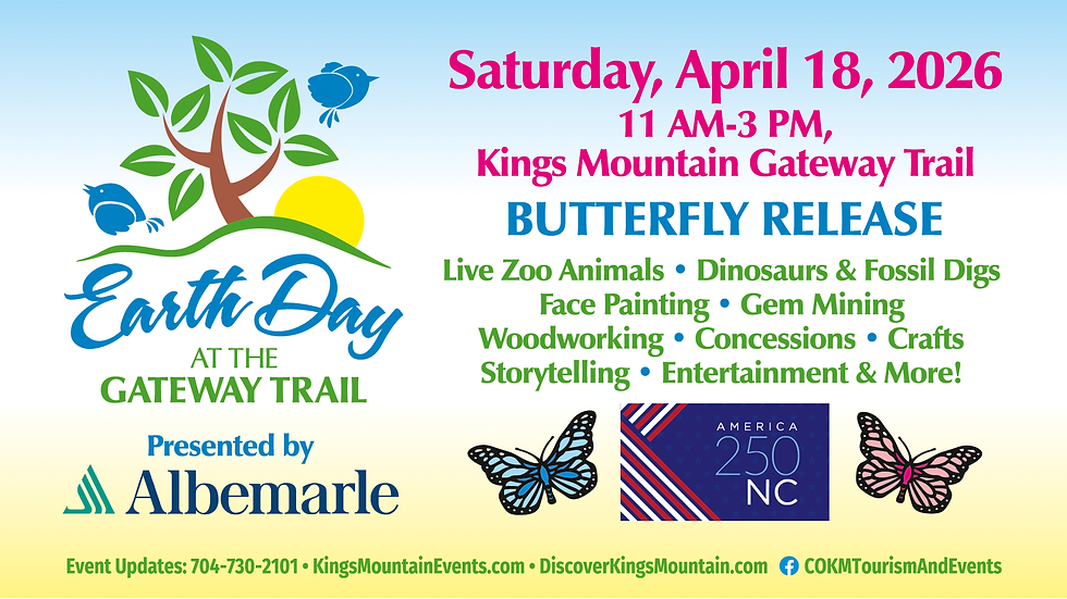 The City of Kings Mountain, in partnership with the Kings Mountain Gateway Trail, Presenting Sponsor Albemarle Corporation and Metal Recycling Services, will celebrate the 56th Anniversary of Earth Day by hosting an Earth Day Celebration on Saturday, April 18th, 2026.